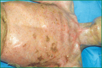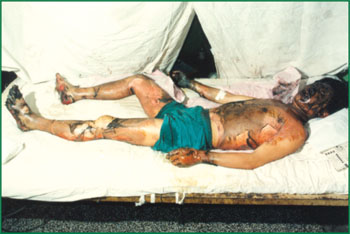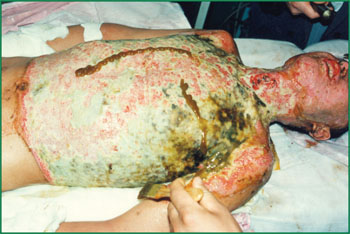 1、 Ⅲ度燒傷占總面積85%的病人,右側(cè)為皮膚全層壞死(病理切片)。