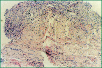 4、 燒傷壞死皮膚液化排除創(chuàng)面形成纖維隔離膜,新生的皮膚組織再生復(fù)原創(chuàng)面(病理切片),(傷后第20天)。