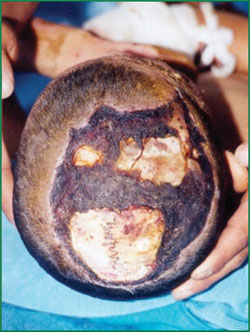 2、傷后2天清創(chuàng),按骨燒傷的治療方法,對顱骨鉆孔(穿透外板)外敷MEBO治療。