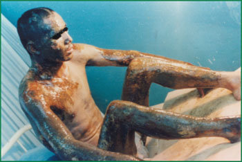 1、患者,男,34歲,硫酸燒傷,面積60%,(深Ⅱ度30%,淺Ⅲ度30%)創(chuàng)面焦痂呈黑色和棕褐色,外涂MEBO保護(hù)創(chuàng)面組織。