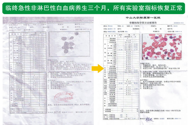 另一位患者是白血病,大家知道白血病比較可怕,但對于我們的養(yǎng)生來說,又顯得不是那么可怕。我們做的動物實驗中可以讓骨髓再生。我們用鈷60的照射破壞骨髓,無論怎么破壞,通過讓骨髓再生,動物的骨髓都可以保持健康,凡是沒有吃再生物質(zhì)的則繼續(xù)惡化。這位患者醫(yī)院診斷為白血病,已經(jīng)多次復發(fā),醫(yī)院對這位患者已經(jīng)放棄了醫(yī)學治療。1月底加入我們的癌癥養(yǎng)生計劃。到3月3號檢查,她的骨髓已經(jīng)變成正常的了,其身體現(xiàn)在和正常人一樣。