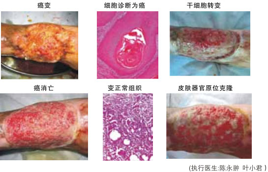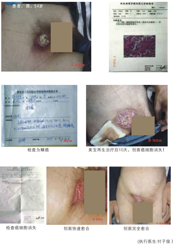 (5)人體癌組織原位試驗(yàn)結(jié)果:選皮膚鱗癌做試驗(yàn)對(duì)象,先將癌組織表面的壞死組織清楚,暴露新鮮成活的癌組織,而后外敷再生物質(zhì),每日早晚更新一次,21天后,皮膚癌創(chuàng)面癌細(xì)胞消失,而后皮膚愈合。