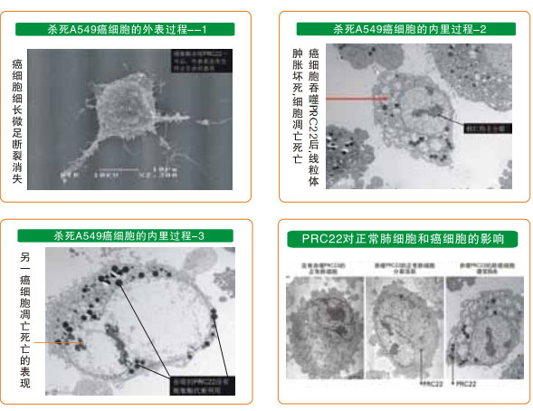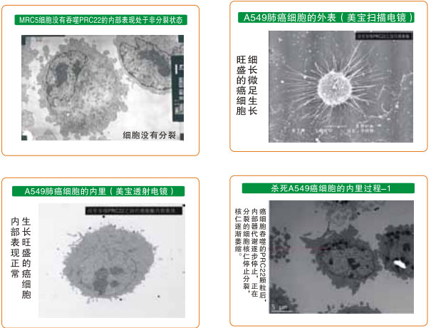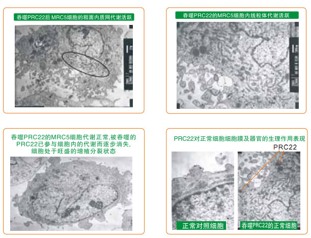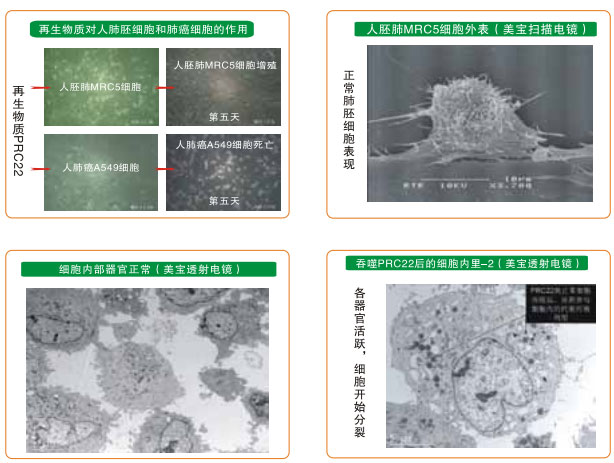 在獲得再生物質(zhì)對(duì)癌細(xì)胞生命作用研究結(jié)果的基礎(chǔ)上,我們選人胚肺MRC5細(xì)胞作為正常細(xì)胞,人肺癌A549細(xì)胞作為癌細(xì)胞,用人肺組織的再生營(yíng)養(yǎng)物質(zhì)作為試驗(yàn)物質(zhì),對(duì)正常細(xì)胞和癌細(xì)胞進(jìn)行體外培養(yǎng),觀察再生物質(zhì)進(jìn)入細(xì)胞內(nèi)是如何產(chǎn)生作用的。其結(jié)果為,正常細(xì)胞吞入再生物質(zhì)后,細(xì)胞內(nèi)的各個(gè)器官代謝旺盛,細(xì)胞核分裂表現(xiàn)活躍,再生物質(zhì)在細(xì)胞內(nèi)被代謝消耗;沒(méi)有加入再生物質(zhì)培養(yǎng)的正常肺細(xì)胞對(duì)照組的細(xì)胞,沒(méi)有產(chǎn)生明顯的增殖變化。而肺癌細(xì)胞吞入再生物質(zhì)后,細(xì)胞內(nèi)各器官代謝立即停止,第一天,細(xì)胞自斷偽足,細(xì)胞內(nèi)的線粒體腫脹死亡,細(xì)胞核仁萎縮,吞入的再生物質(zhì)沒(méi)有發(fā)生代謝消耗性反應(yīng),第二天后細(xì)胞凋亡性死亡,吞入的再生物質(zhì)完好無(wú)損。如此的試驗(yàn)結(jié)果認(rèn)為,再生物質(zhì)對(duì)正常細(xì)胞內(nèi)各器官的作用是一種再生營(yíng)養(yǎng)素,而對(duì)于癌細(xì)胞內(nèi)的器官則是致死性物質(zhì)。試驗(yàn)結(jié)果還表明,再生物質(zhì)的作用首先發(fā)生在細(xì)胞質(zhì)內(nèi)的器官中,而后影響細(xì)胞核內(nèi)。這樣的結(jié)果所見(jiàn)可能是人類攻克癌癥的一個(gè)嶄新途徑。(參見(jiàn)下列系列電鏡圖片)
