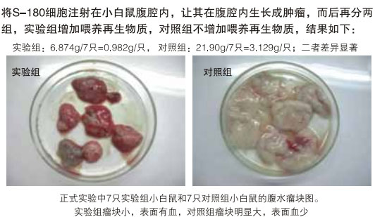 將S-180細(xì)胞,注射到小白鼠腹腔內(nèi),讓其在腹腔內(nèi)形成腫瘤組織,在形成一定大小時(shí)分為兩組,一組增加一定量再生物質(zhì)的喂養(yǎng)(實(shí)驗(yàn)組),一組不加再生物質(zhì)喂養(yǎng)(對(duì)照組)。一段時(shí)間后,將小白鼠腹腔內(nèi)的腫瘤組織取出,進(jìn)行稱量,喂養(yǎng)再生物質(zhì)組的小白鼠腫瘤組織塊明顯地小于沒(méi)有喂養(yǎng)再生物質(zhì)組小白鼠腹腔內(nèi)的腫瘤組織塊,數(shù)據(jù)是:實(shí)驗(yàn)組0.982g/只,對(duì)照組3.12g/只,且腫瘤組織的顏色外觀明顯不同。