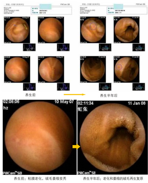 3. 衰老的胃腸粘膜再生復(fù)原:衰老的胃腸粘膜能復(fù)原回較年輕的粘膜,這在醫(yī)學(xué)和保健學(xué)上,從沒有人想到。而在本研究的再生復(fù)原療法上,已經(jīng)實現(xiàn)了。我們的研究表明,人過40歲,人的胃腸粘膜等開始走向衰老,其衰老程序的啟動比任何器官都早,過了50歲,人的胃腸粘膜就有約一半的細胞不發(fā)揮應(yīng)有的功能,并且衰老和凋亡了,到90歲,有功能的細胞也只剩下不到10%。我們的研究臨床應(yīng)用結(jié)果表明,只要進行半年的胃腸再生復(fù)原養(yǎng)生,衰老的胃腸粘膜就能原位再生復(fù)原,而后繼續(xù)保持再生復(fù)原養(yǎng)生,就能保障胃腸功能維持在正常較年輕的狀態(tài)。(圖14 為腸鏡圖片)