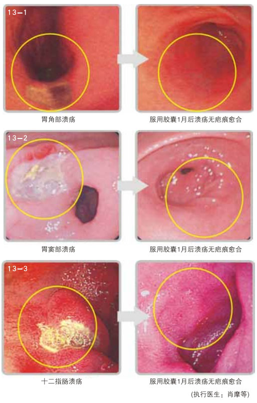 2. 胃腸潰瘍:這些疾病,目前醫(yī)學(xué)上采取的是疤痕修復(fù)潰瘍創(chuàng)面,從而導(dǎo)致復(fù)發(fā)不愈。采取本再生療法,新的胃腸粘膜可從潰瘍的創(chuàng)面上原位再生出來,取代了潰瘍創(chuàng)面,沒有疤痕,徹底治愈了胃腸潰瘍。(圖13 為胃鏡圖片)