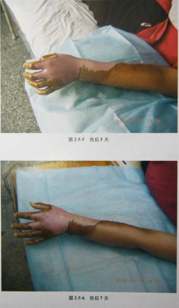 2眼觀表現(xiàn):局部紅腫明顯,起水皰、壁薄,內(nèi)含淡黃色血漿樣液體,劇痛;水皰破后創(chuàng)面可見潮紅、濕潤,質(zhì)地較軟,溫度較高。