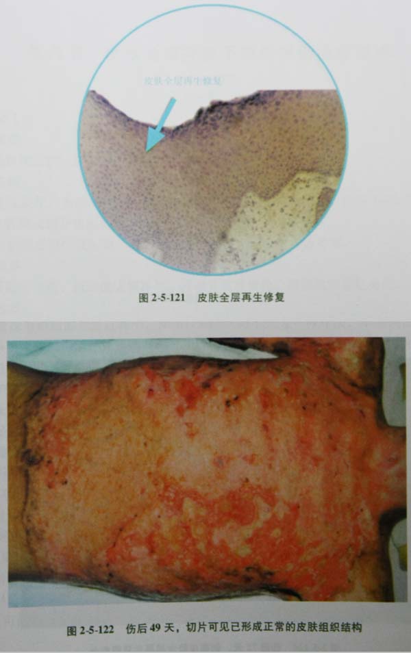 Ⅲ度淺型燒傷皮膚全層壞死,故治療后創(chuàng)面暫無滲出,第3天始見創(chuàng)面壞死組織層表面有白色液化物,第5天液化物開始增多,創(chuàng)面壞死層一般在傷后第2535天能完全液化。創(chuàng)面基底自第3540天后漸向皮面凸起,創(chuàng)面肉芽化,部分肉芽創(chuàng)面由創(chuàng)緣上皮向中心蔓延,創(chuàng)面縮小。創(chuàng)面邊緣上皮蔓延的同時,肉芽組織表面出現散在上皮點,并逐漸擴散,互相融合,封閉創(chuàng)面。