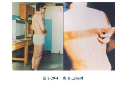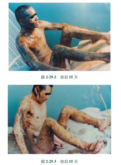 [病例]患者,男,34歲,硫酸燒傷,面積60%,(深Ⅱ度30%,淺Ⅲ度30%)創(chuàng)面焦痂呈黑色和棕褐色,外涂MEBO保護(hù)創(chuàng)面組織(圖2291)。