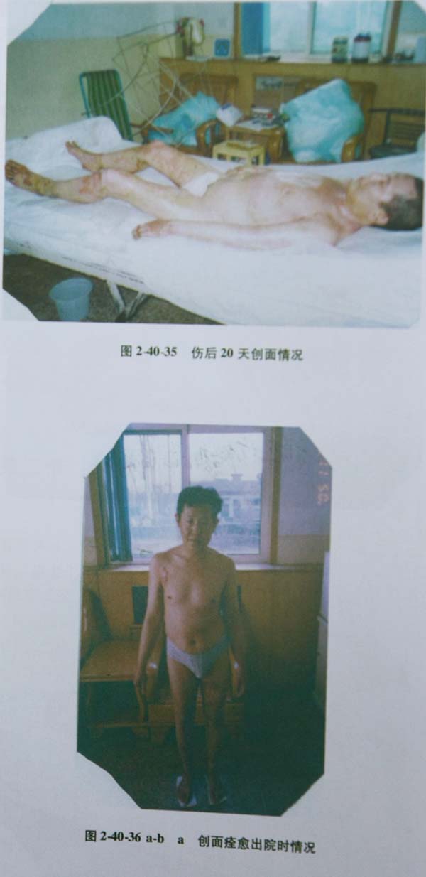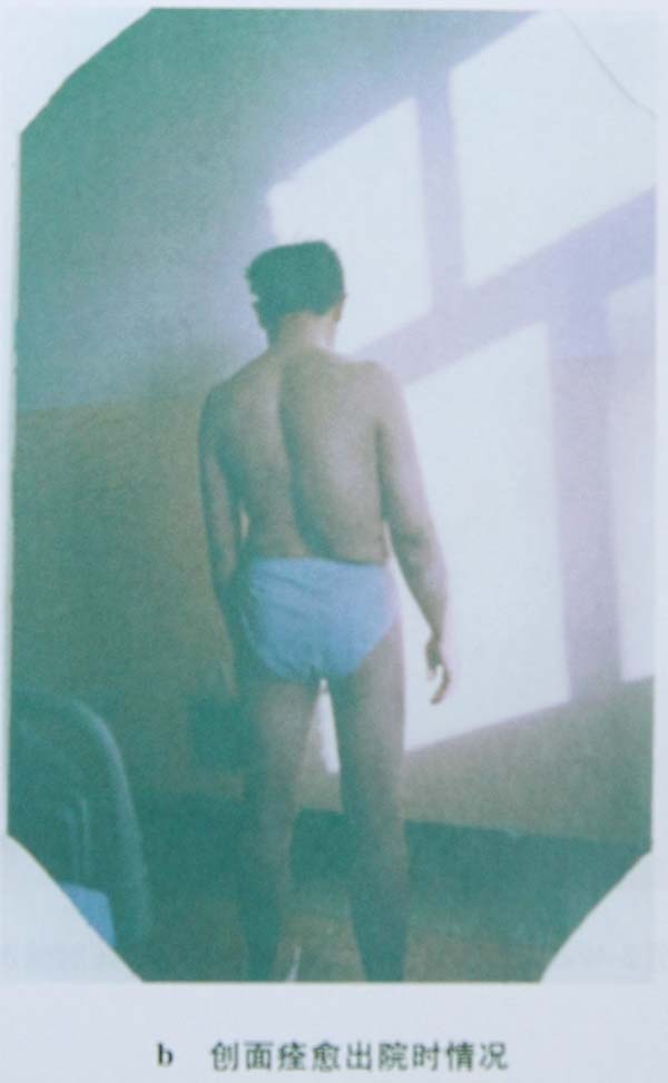 [病例3]患者賈××,36歲,石家莊市尼龍廠工人,住院日期200494日,出院日期20041130日,患者于工作中不慎從五米高處摔下,跌入電石爐中,造成全身堿燒傷,急入石家莊井陘礦務(wù)局醫(yī)院就診。入院診斷工業(yè)堿水全身Ⅱ—Ⅲ度燒傷總面積達(dá)92%TBSA(淺Ⅱ度40%,深Ⅱ度27%,Ⅲ度淺型10%,Ⅲ度深型15%)。即刻采用美寶濕潤(rùn)燒傷膏外涂保護(hù)創(chuàng)面,同時(shí)采取全身系統(tǒng)治療。包括強(qiáng)心、抗休克、抗感染、保肝、保腎、保護(hù)胃腸黏膜、持保水、電解質(zhì)平衡和酸堿平衡、營(yíng)養(yǎng)支持等綜合搶救措施,創(chuàng)面全程規(guī)范應(yīng)用燒傷皮膚原位再生技術(shù)和專(zhuān)用藥品美寶濕潤(rùn)燒傷膏。患者于入院后24小時(shí),發(fā)生全身侵襲性感染,血常規(guī)WBC13×109/L下降到5×109/L、PLT147×109/L下降到8×109/L;肝功 谷丙轉(zhuǎn)氨酶高達(dá)362U/L,精神差,腹脹明顯,體溫395℃,呼吸淺快,36/分。心率快,134/分??诖阶辖C,創(chuàng)面灰暗,并見(jiàn)片狀出血點(diǎn),考慮為膿毒癥及并發(fā)肝、心等臟器功能不全。當(dāng)即給予高效、足量抗生素控制感染,加強(qiáng)心腦肝腎等臟器的支持保護(hù),對(duì)創(chuàng)面進(jìn)行徹底清理?yè)Q藥。