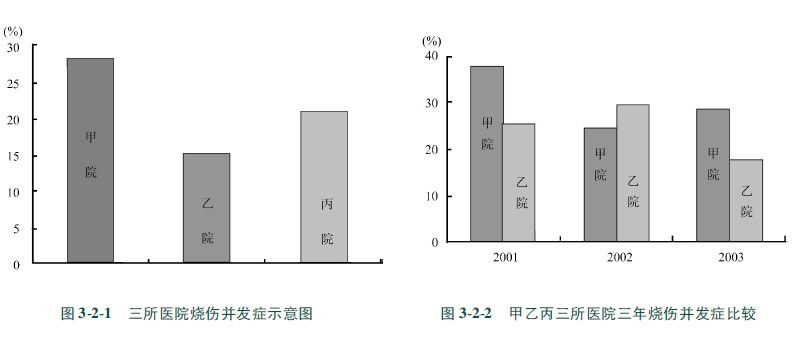 示例322甲、乙、丙三所醫(yī)院在2001~2003年大面積燒傷并發(fā)癥發(fā)生率統(tǒng)計(jì)結(jié)果為:甲院連續(xù)三年大面積燒傷并發(fā)癥發(fā)生率為38%、25%、29%;乙院為26%、30%、18%,繪制復(fù)式條圖(圖322)。