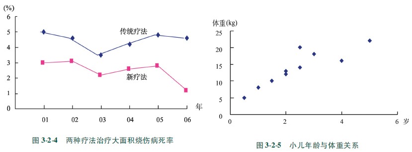 適用于描述雙變量計(jì)量資料的兩個(gè)定量變量之間的關(guān)系,它用線段的上升與下降表示某事物在時(shí)間上的發(fā)展變化趨勢(shì),或某現(xiàn)象隨另一現(xiàn)象變遷的情況。繪制線圖的要求是兩個(gè)變量的觀察值必須一一對(duì)應(yīng),即某一個(gè)變量的觀察值僅對(duì)應(yīng)另一個(gè)相應(yīng)的觀察值。它以自變量的觀察值為橫坐標(biāo),以應(yīng)變量的觀察值為縱坐標(biāo),在平面直角坐標(biāo)系中,用點(diǎn)的形式描述出每一對(duì)觀察值所在的位置,然后用直線連接相鄰的點(diǎn)。