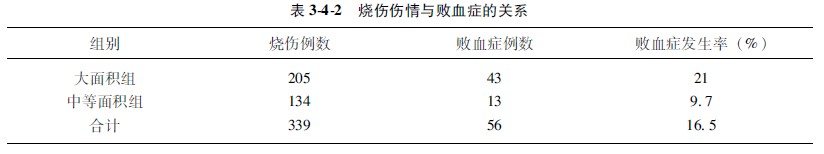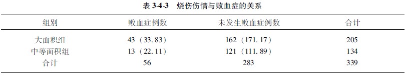 3計(jì)算各組的理論數(shù)T值:理論數(shù)值是根據(jù)檢驗(yàn)假設(shè)推論的兩組病人數(shù)中應(yīng)有的發(fā)生敗血癥人數(shù),即兩組都按165%患病率計(jì)算,應(yīng)當(dāng)有多少人患病與不患病。大面積燒傷組205人,乘以合計(jì)患病率165%,便是大面積燒傷組理論上應(yīng)當(dāng)發(fā)生敗血癥的人數(shù)(205×165%=3383),即為理論值;而未發(fā)生敗血癥的人數(shù)為(205-3383=17117)17117。同理,再求出中等燒傷面積組病人的理論值為2211,不發(fā)生敗血癥的理論值為(134-2211=11189)11189。