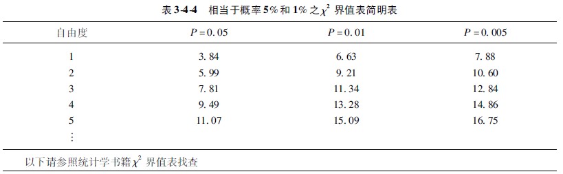χ2值無(wú)單位,與它相應(yīng)的概率為5%的χ2值(χ2 005)和概率為1%的χ2值(χ2001),可由卡方簡(jiǎn)明界值表344中查出。