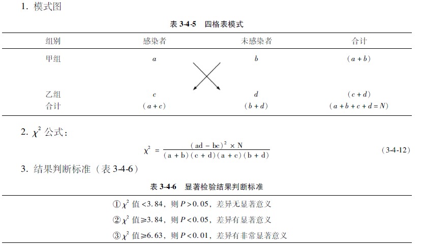 四格表資料的χ2檢驗(yàn)法是應(yīng)用最為廣泛和最為方便的一種方法,它所檢驗(yàn)的僅是兩個(gè)率的比較?;灸J綀D、公式和結(jié)果判斷標(biāo)準(zhǔn)如下: