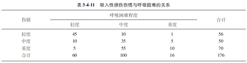示例3410(計(jì)數(shù)資料相關(guān)分析):某燒傷中心觀察了176例吸入性損傷病人的不同傷情與呼吸困難的各自例數(shù),問(wèn)呼吸困難程度與吸入損傷傷情之間有無(wú)關(guān)聯(lián)性(數(shù)據(jù)資料匯于表3411中)?