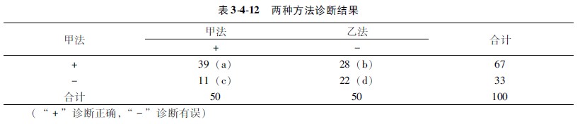 示例3411:100個(gè)深Ⅱ度燒傷創(chuàng)面,每個(gè)創(chuàng)面分別用兩種方法(甲法與乙法)診斷。結(jié)果:甲法陽(yáng)性者為67個(gè),乙法陽(yáng)性者50個(gè);其中甲乙兩法均陽(yáng)性者(a)39個(gè),甲乙兩法均陰性者(d)22個(gè),甲法陽(yáng)性乙法陰性者(d)28個(gè),乙法陽(yáng)性甲法陰性者(c)11個(gè)(資料見(jiàn)表3412)。問(wèn)甲乙兩種方法的診斷結(jié)果有無(wú)關(guān)聯(lián)及統(tǒng)計(jì)學(xué)差異?