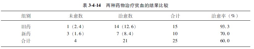 示例3313:某醫(yī)生用新舊兩種方法治療燒傷后貧血病人共計(jì)27例,結(jié)果匯于表3414中,問(wèn)新舊藥物的療效有無(wú)差異?
