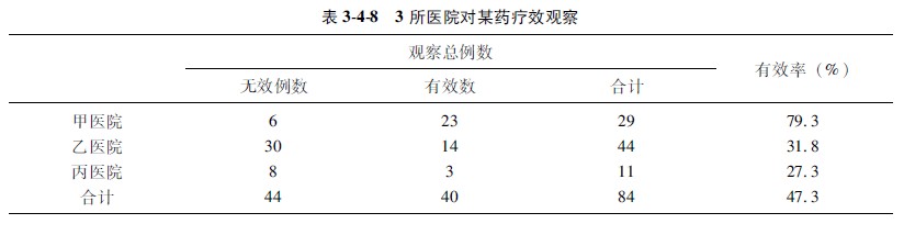 示例337甲乙丙三所醫(yī)院同期對(duì)某藥進(jìn)行抗感染療效觀察,甲院觀察了29例,有效(23例)率為793%,乙院觀察了44例,有效(14例)率為318%,丙醫(yī)院觀察了11例,有效(3例)率為273%(資料見(jiàn)表348)。問(wèn)3所醫(yī)院抗感染治療的總體有效率是否有顯著意義?