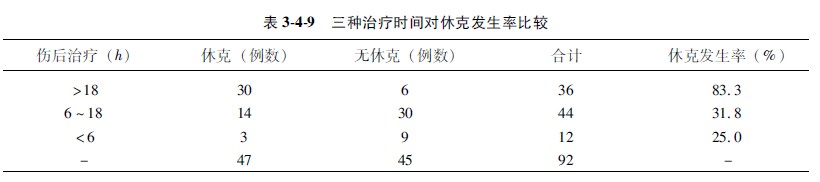 示例348(百分比相互比較):某醫(yī)院觀察嚴(yán)重?zé)齻∪嗽缙谘舆t治療對(duì)休克發(fā)生率有無(wú)影響,觀察時(shí)間分別為傷后大于18小時(shí)(甲組)、傷后6~18小時(shí)(乙組)和6小時(shí)以?xún)?nèi)(丙組)3個(gè)接受治療小組,結(jié)果匯于表349中。問(wèn)延遲治療對(duì)燒傷休克的發(fā)生率有無(wú)統(tǒng)計(jì)學(xué)差異,或相互之間有無(wú)關(guān)聯(lián)?