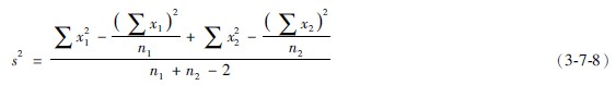 式中的n1和n2代表組1和組2的個(gè)樣本例數(shù),s2是合并標(biāo)準(zhǔn)差的平方。為了計(jì)算方便,先以公式求出合并標(biāo)準(zhǔn)差的平方(s2):