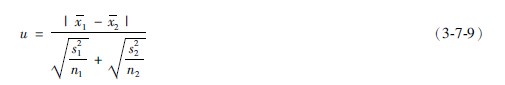 當(dāng)兩個(gè)樣本數(shù)量較大時(shí)(即兩組樣本皆大于50),不必查t值表,可采用μ檢驗(yàn)方法。其公式為: