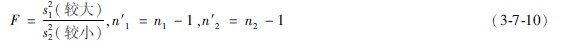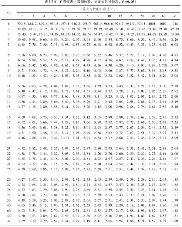式中s21為較大樣本的方差,s22為較小樣的方差,相應(yīng)的自由度分別為n′1和n′2,相應(yīng)的樣本含量分別為n1和n2。由于恒取s21>s22,故F值必然大于1,求得F值后查F界值表(方差齊性檢驗(yàn)用表,表376),得P值(F值愈大,P值愈小),作出結(jié)論。