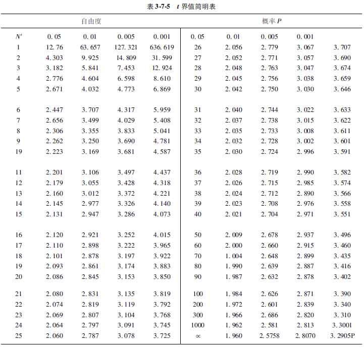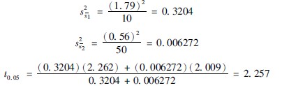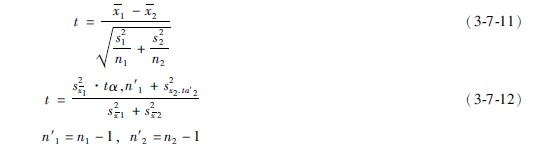當(dāng)確定檢驗(yàn)水準(zhǔn)α后,公式3712中的tα·n′1和tαn′2即可按n′1和n′2由表375查得,s2x1、s2x2分別為兩均數(shù)的標(biāo)準(zhǔn)誤的平方和。