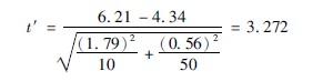 若兩個(gè)總體的方差不齊時(shí),即σ21≠σ22時(shí),兩小樣本均數(shù)的比較,可選擇以下方法:①采用適當(dāng)?shù)淖兞孔儞Q,使之達(dá)到方差齊的要求;②采用不要求方差齊的方法比較其分布,如秩和檢驗(yàn);③采用近似法t′檢驗(yàn),由于t′不服從t分布,故需要按公式(3710)求界值t(系近似值)。公式分別為: