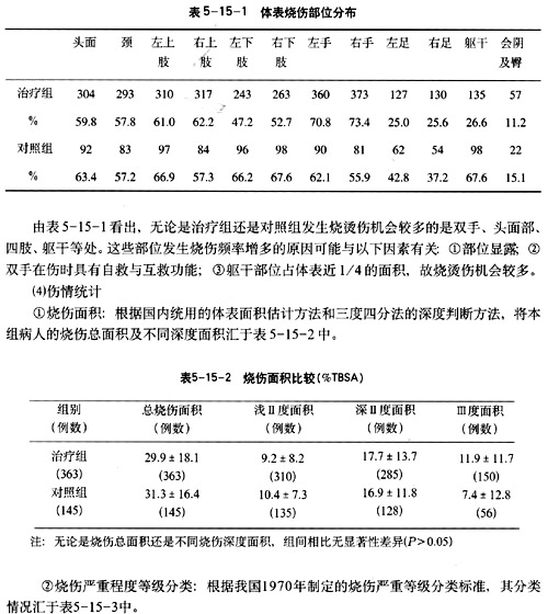 由表5-15-3看出,兩組病人重度和特重度燒傷均占較高比例,即治療組燒傷總面積大于50%BSA者,或是Ⅲ度燒傷面積超過20%BSA者已達75例;對照組31例,分別占各組例數(shù)的20.7%和21.3%,或者說,兩組重度以上燒傷病例已超過或接近總例數(shù)的40%。他們中最大燒傷面積者達94%BSA,同時Ⅲ度面積達73%BSA。由此說明,無論是治療組還是對照組,傷情都是相當嚴重的,而目前在國內(nèi)外的治療難度也是相當大的。