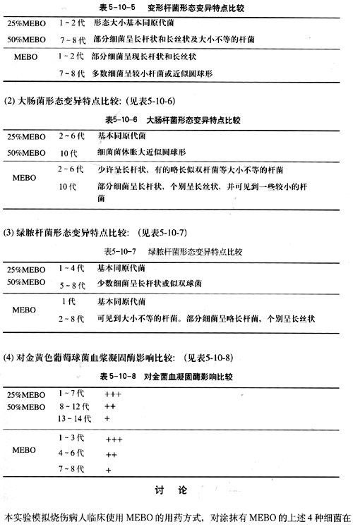 37℃,20~22h培養(yǎng)后進行觀察比較。實驗結(jié)果表明MEBO對上述4種細菌在導致形態(tài)變異,使綠膿桿菌色素消失,和使金黃色葡萄球菌血漿凝固酶產(chǎn)生能力減弱等方面都比25%MEBO和50%MEBO的作用顯著,而且出現(xiàn)早,形態(tài)變異的特點也有差異。實驗結(jié)果與以前報道的不同濃度的MEBO的抗菌作用是一致的。MEBO的藥效是與MEBT配合時產(chǎn)生的。