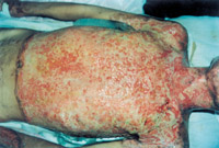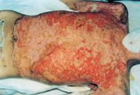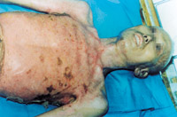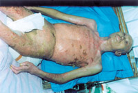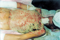 入院后即快速補(bǔ)液糾正休克,行氣管切開(kāi),改善通氣功能,左前臂、雙小腿Ⅲ度環(huán)形焦痂切開(kāi)減張,改善肢端血運(yùn)。上腔靜脈穿刺置右心漂浮導(dǎo)管行心功能各項(xiàng)指標(biāo)監(jiān)測(cè)。于傷后第二天行四肢切痂微粒植皮,傷后第六天行胸腹部切痂植大張開(kāi)洞異體表,傷后10天(術(shù)后4天)胸腹部嵌植小片自體皮。患者傷后28天出現(xiàn)嚴(yán)重綠膿桿菌敗血癥,持續(xù)低溫昏迷一周,經(jīng)全力搶救,敗血癥得以控制;又先后9次行植皮手術(shù),大部創(chuàng)面封閉;曾于傷后43天出現(xiàn)左眼角膜潰瘍,以點(diǎn)眼、球后結(jié)膜下注射等治療,潰瘍愈合。住院期間為預(yù)防應(yīng)激潰瘍,控制感染,防止肺部并發(fā)癥等,亦采取了相應(yīng)的措施。共住院70天。