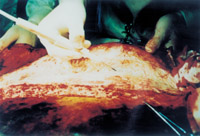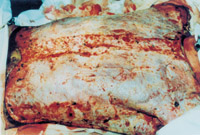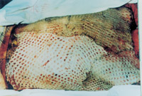 3-8 將異體皮拉網(wǎng)式覆蓋在手術(shù)后的創(chuàng)面上。4天后將自體皮切成碎粒(或片)嵌入異體皮的網(wǎng)洞內(nèi)