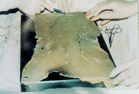 3-7 取異體皮,打洞拉網(wǎng),將其作為臨時(shí)覆蓋物