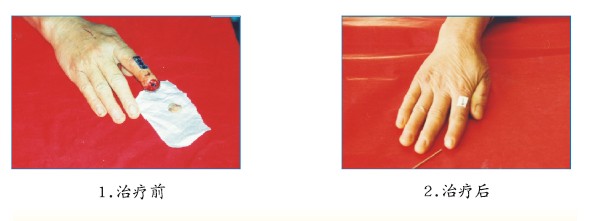 女性患者,57歲,食指末節(jié)離斷缺損,于2003年6月27日就治于山東省榮成人民醫(yī)院,經(jīng)使用MEBT/MEBO治療。創(chuàng)面30天后愈合, 食指末節(jié)再生,恢復(fù)了正常的形態(tài)和功能。
