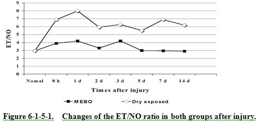 The normal level of ET in plasma was 42.812.2 pg/ml, NO: 14.53.6 mol/L, the ratio of ET/NO 2.95. Table 12 shows that ET in both groups markedly increased after injury, but we see that the increment in the BRT with MEBT/MEBO group was much lower than that in the dry-exposed group. The MEBO group returned to normal level on the 5th day postburn as compared to the dry-exposed group’s value remained at a high level even at day 14. Table 12 shows an obvious increase of NO in both groups at 8 h. In the BRT with MEBT/MEBO group, the NO gradually decreased to normal by day 3 compared to day 7 for the dry-exposed group. Figure 12 shows that the ratio of ET/NO in the BRT with MEBT/MEBO group decreased to 2.95 after 1 day, while that in the dry-exposed group remained much higher than 2.95 at all phases.