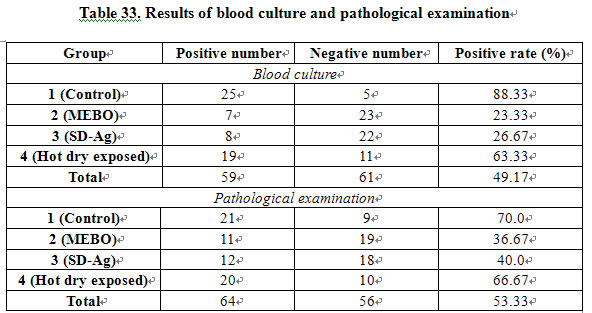 1) Evaluation of Antibacterial Effect of Hot Dry-Exposed Therapy: In 1949, Wallace introduced the concept of dry-exposed burns therapy [16,17] in which wound was directly exposed to air at a certain temperature. He believed that direct exposure of the wound might allow the formation of a layer of dry eschar/crust by exudation and necrotic tissue on the wound surface, which served as a barrier against the bacterial contamination. Our study showed that comparing the hot dry-exposed therapy group to untreated control group, there was no obvious difference with respect to bacterial count of sub-eschar viable tissue, positive rate of blood culture and positive rate of pathological examination. We now suggest that the hot, dry-exposed therapy has no significant effect on controlling invasive infection with P. aeruginosa of third-degree burns wounds.