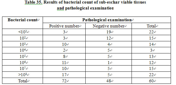 3) Roles of Bacterial Count of Sub-eschar Viable Tissues and Pathological Examination in the Diagnosis of Burn Wound Infection: Infection has long been one of major life-threatening causes of burn victims. The extent of infection depends on the invasiveness of the pathogenic micro-organism and the power of host resistance [12]. Micro-organism invasiveness has a close correlation to the strains, toxicity and quantity. Therefore, a variety of methods for determining the bacterial count on burns wounds have been developed.