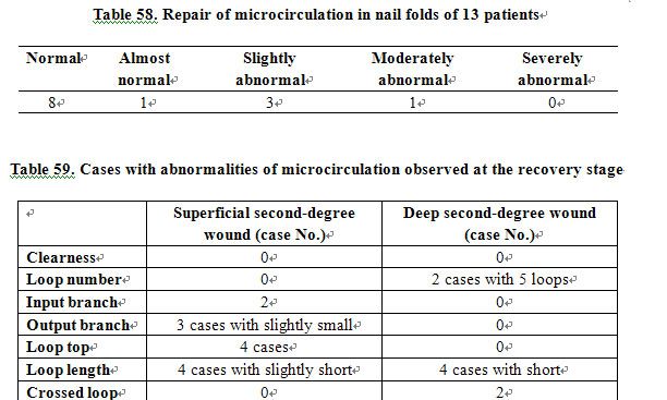 The microcirculation status was scored and classified according to the standard for quantitative analysis of nail fold microcirculation established by Tian [1] (Table 58). Abnormal results observed in 13 patients (7 cases with superficial second-degree burns and 6 cases deep second-degree), and are listed in Table 59.