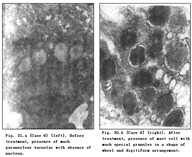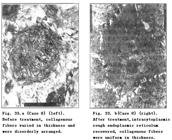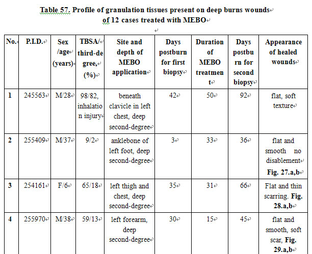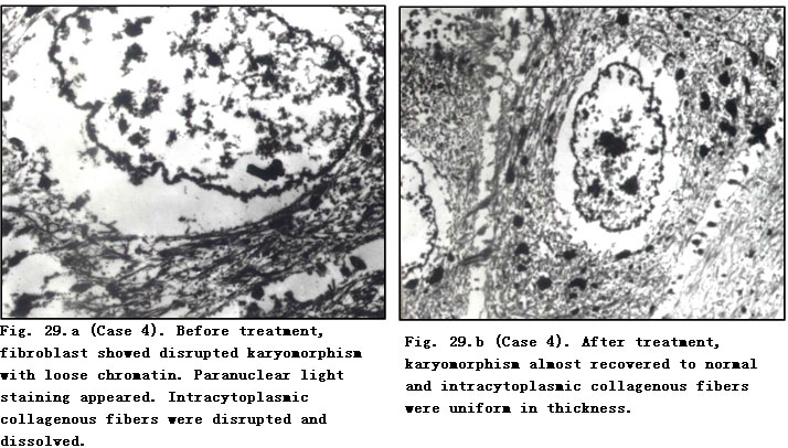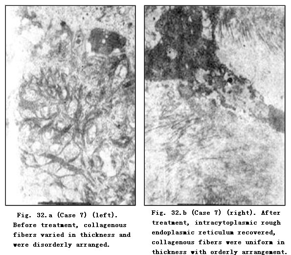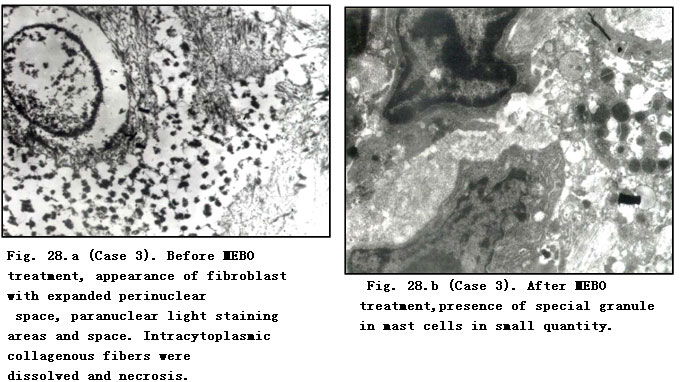 Electron Microscope: Before treatment, fibroblasts showed disrupted karyomorphism, contracted nucleoli, expanded perinuclear space and paranuclear vacuolar degeneration. A faint staining area was observed in the paranuclear margin of mussily arranged fibrocytes. Collagenous fibers varied in thickness with breaking and dissolution. After MEBO treatment, the nucleoli and nuclei of fibroblasts recovered to normal and collagenous fibers appeared to be uniform in thickness and orderly in arrangement. Master cells were occasionally visible after treatment in a few cases. Fibrocytes recovered to normal with orderly arrangement and intracytoplasmic rough endoplasmic reticulum appeared (Table 57).