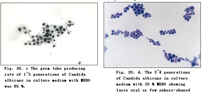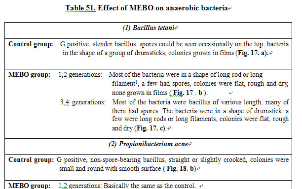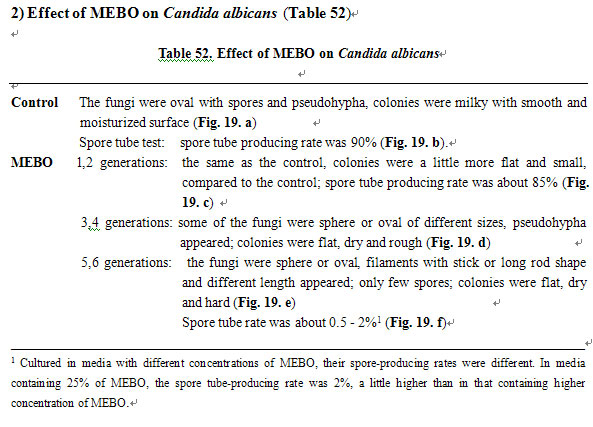 Bacillus tetani is an anaerobic spore-bearing bacteria. After being cultured in MEBO-containing media, long filament variants appeared, and in 3 generations many of them formed only one spore. This spore is not the vegetative form of the bacteria as it cannot proliferate under normal conditions. Spore keeps the bacteria alive though dormant. Only under favorable conditions can the spore proliferate and produce exotoxin to cause disease. After cultured in MEBO-containing media for 6 generations, in Candida albicans the number of blastospores was significantly reduced, the spore tube producing rate was only 0.5% - 2%, while the normal fungi had a spore tube producing rate of 90%. The above facts prove that MEBO has an inhibitory effect on the proliferation and pathogenicity of Bacillus tetani and Candida albicans.