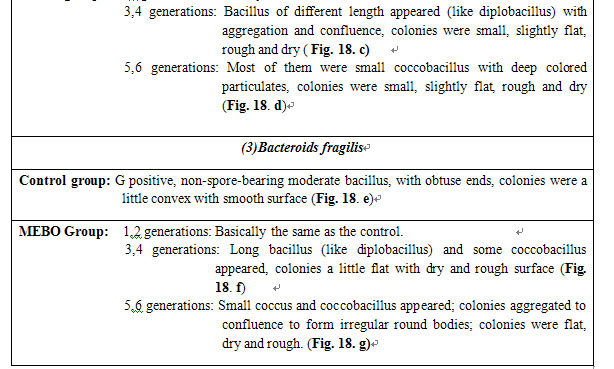 1. Bacteroids fragilis, Propionibacterium acnes and Bacillus tetani were inoculated respectively into the medium containing MEBO and cultured for multiple generations during which morphological and colony variations at each generation were observed.