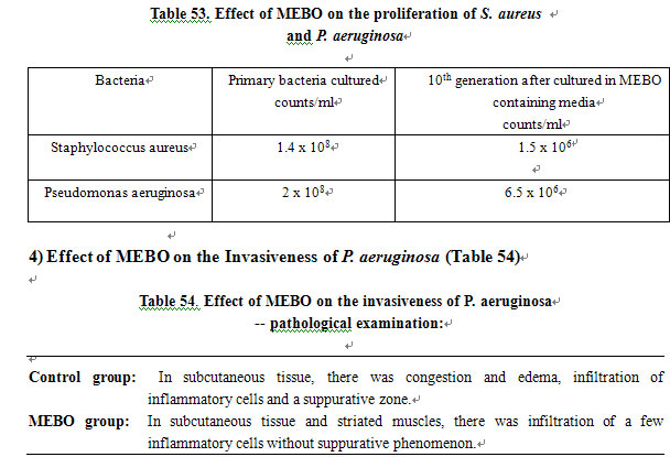 1). The effect of MEBO on anaerobic bacteria is given in Table 51 and depicted in Figures 17-19. The effect of MEBO on Candia albicans is given in Table 52 and depicted in Figure 20. The effect of MEBO on the proliferation rates of Staphylococcus aureus and Pseudomonas aeruginosa is given in Table 53. The effect of MEBO on the invasiveness of Pseudomonas aeruginosa is shown in Table 54.