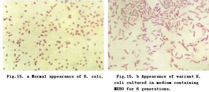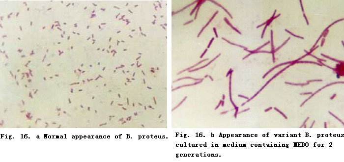 became long and filamentous. In culture medium containing 25 % MEBO, 90 % of the bacteria became long filamentous or long rod, and then became small