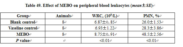 Effect on Peripheral Blood Leukocytes. MEBO significantly increased the peripheral blood count of white blood cells and polymorphonuclear leukocyte (PMN %) in mice (Table 49).