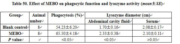 Effect on Phagocytic Function and Lysozyme Activity: MEBO significantly promoted the phagocytic function of phagocytes and increased the lysozyme activity in the abdominal cavity fluid (Table 50).
