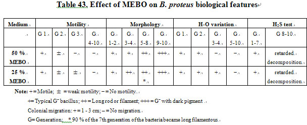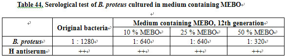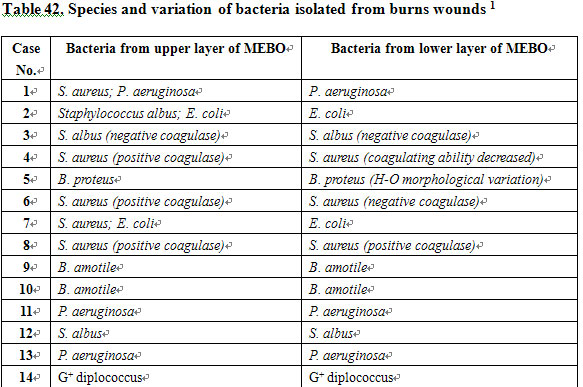 Table 42 shows that after treatment with MEBO, B. proteus in the wounds had H-O morphological variation. S. aureus in the wounds turned from positive plasma coagulase to negative, or the plasma coagulating ability decreased.