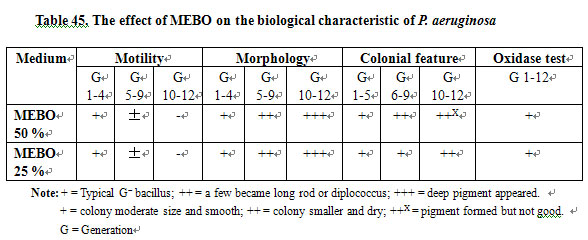 Effect of MEBO on the Biological Characteristic of P. aeruginosa. It was found that P. aeruginosa cultured in MEBO-containing medium started to decrease its motility from the 5th generation, and motility vanished in the 10th generation. Variations of morphology and colonial features of the bacteria were also found (Table 45).