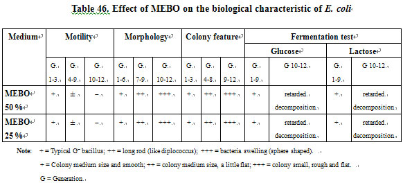 Effect of MEBO on the Biological Characteristics of E. coli. From Table 46, we can see that after proliferation to the 10th generation while cultured in MEBO containing medium, E. coli changed as follows:  It lost motility, became sphere shaped, colonies became smaller, dry and flat (also Figure 16). The decomposition activity of the bacteria to glucose and lactose was retarded (after 32 h).