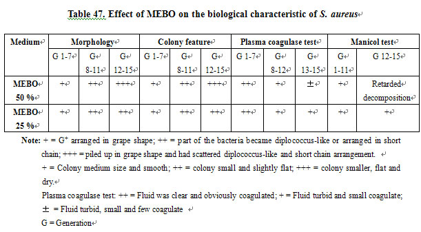 Effect of MEBO on the Biological Characteristic of S. aureus. We found that after 10 generations of S. aureus cultured in medium containing MEBO, bacteria were piled up in grape shape and had scattered diplococcus-like and short chains. Colonies became smaller, flat and dry. The decomposition activity of the bacteria to manitol was retarded (after 32 h), and the variation of plasma coagulation ability was very significant (Table 47) [3].
